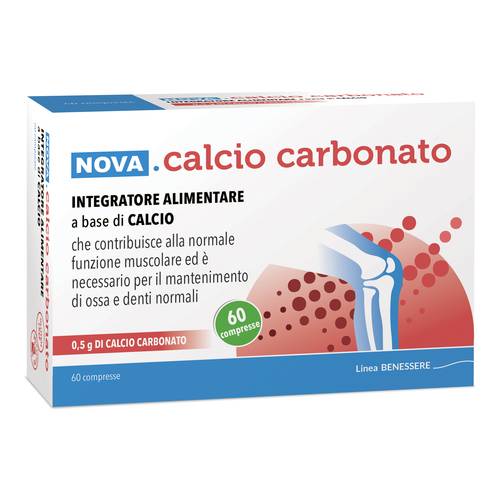 CALCIO CARBONATODescrizione Integratore alimentare a base di calcio, che contribuisce al normale metabolismo energetico e al regolare funzionamento muscolare, interviene nel processo di divisione e di specializzazione delle cellule ed è necessario per il mantenimento di ossa e denti normali. Ingredienti Calcio carbonato; agente di carica: maltodestrine; antiagglomeranti: amido di patata, amido di mais; agente di carica: carbossimetilcellulosa sodica reticolata; antiagglomerante: magnesio stearato. Caratteristiche nutrizionali Valori medi per 1 compressa %VNR* per 6 compresse %VNR* Calcio carbonato di cui calcio 500 mg...